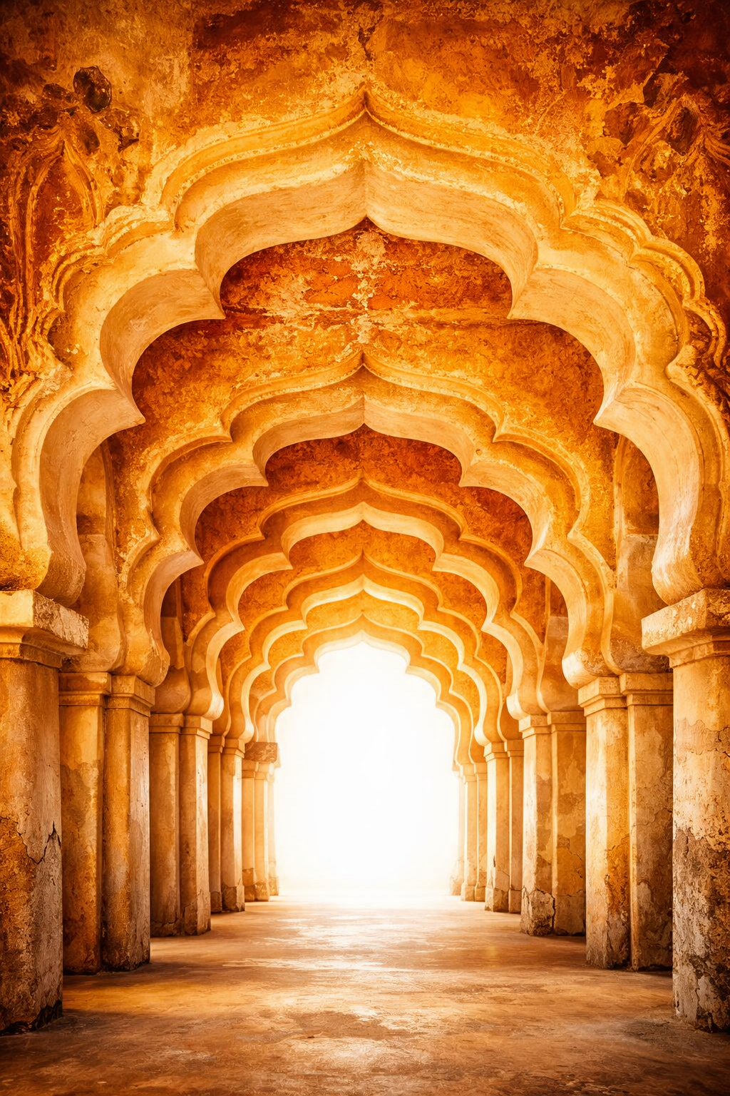 Dit indrukwekkende kunstwerk toont een majestueuze gang met verfijnde gouden bogen die een gevoel van diepte, rust en tijdloze elegantie creëren. De warme tinten en het zachte licht aan het einde van de doorgang zorgen voor een serene en luxueuze uitstraling in ieder interieur.