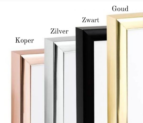 De poster wordt vervolgens door ons ingelijst in één van de 4 beschikbare fotolijsten. Alle poster inlijstingen worden vervaardigd in onze eigen lijstenmakerij, echt handgemaakt dus. Op deze manier kunnen wij onze kwaliteit waarborgen en snelle levertijden hanteren.