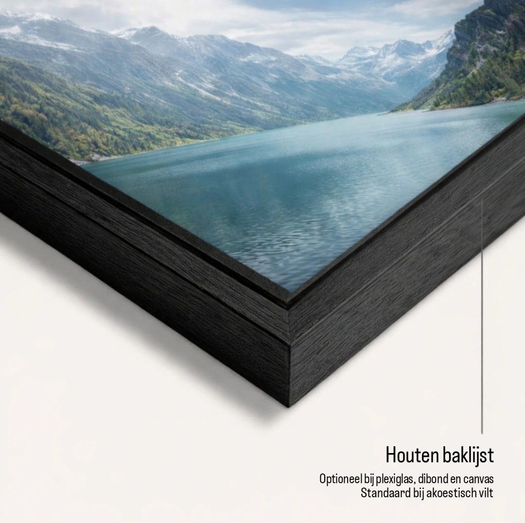 Op zoek naar een extra luxe afwerking? Kies dan voor een zwart houten baklijst. Deze afwerking biedt extra bescherming en voegt dankzij het verfijnde design een stijlvolle, elegante uitstraling toe aan het geheel.