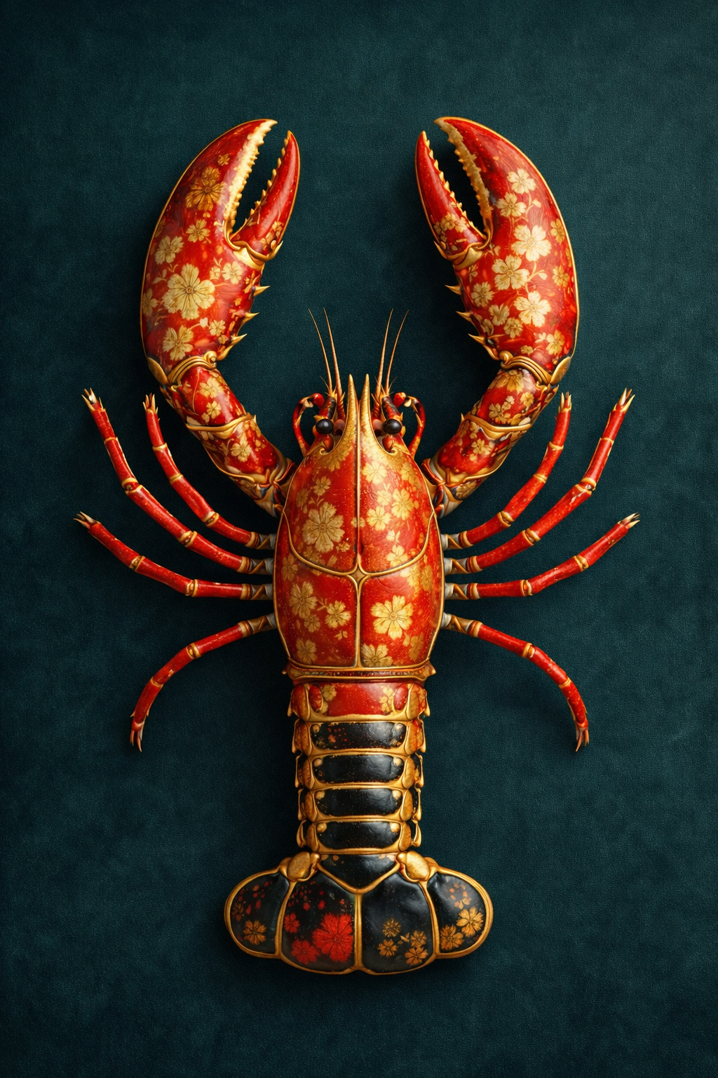 Imperial Lobster is een opvallend en verfijnd kunstwerk waarin een sierlijke kreeft is uitgevoerd in rijke rood- en goudtinten met elegante florale details. De diepe donkergroene achtergrond versterkt het luxe karakter en laat het ontwerp krachtig naar voren komen. Dit exclusieve schilderij combineert maritieme elegantie met een bijna koninklijke uitstraling.