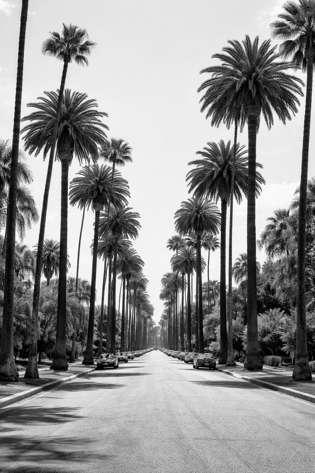 Palm Boulevard toont een iconische palmenlaan in krachtig zwart-wit perspectief, wat zorgt voor een tijdloze en stijlvolle uitstraling. De symmetrische compositie en lange zichtlijn creëren diepte en rust in iedere ruimte.