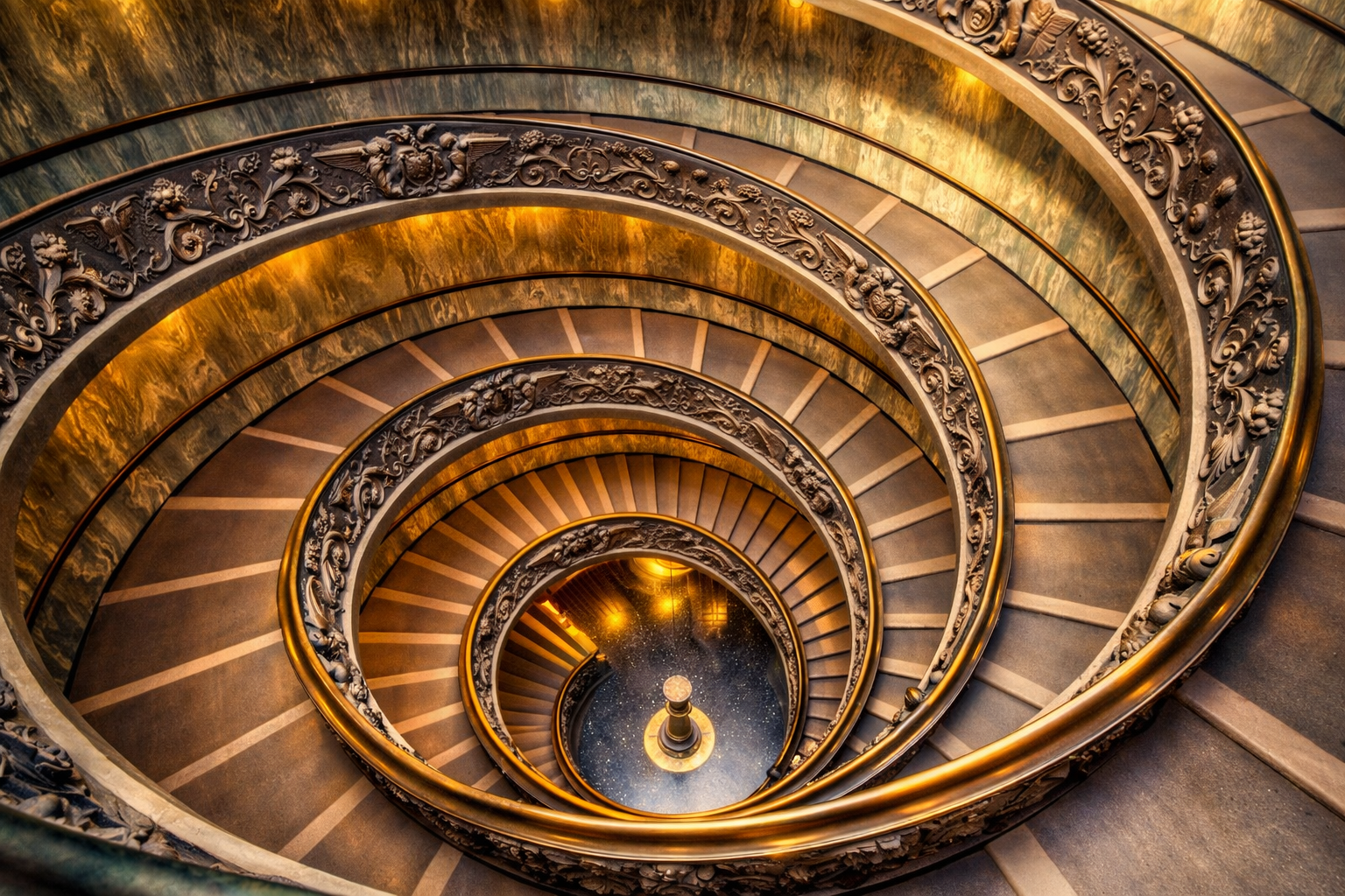 Deze indrukwekkende wanddecoratie toont een elegante spiraaltrap met verfijnde details en warme gouden accenten die direct luxe en diepte in je interieur brengen. De vloeiende lijnen en architectonische symmetrie creëren een rustgevend maar krachtig visueel middelpunt.