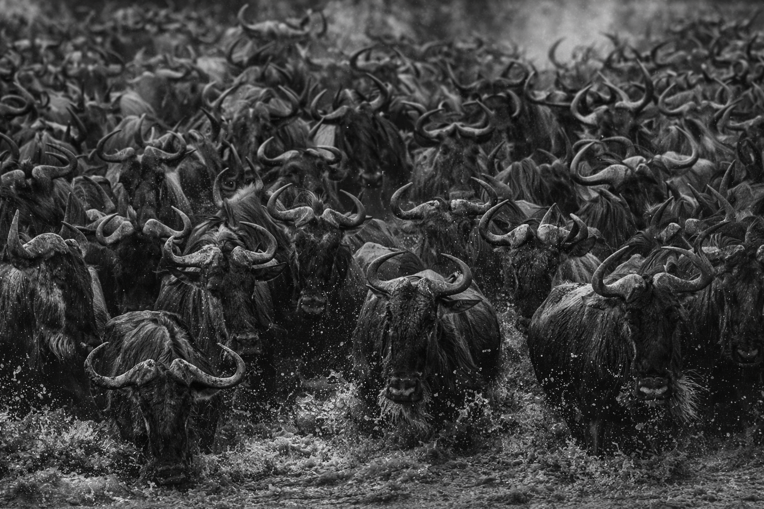Deze indrukwekkende zwart-wit wanddecoratie van een wildebeest migratie vangt de pure kracht en dynamiek van de Afrikaanse wildernis. Het opspattende water en de intense compositie creëren een dramatisch en tijdloos kunstwerk dat direct de aandacht trekt.